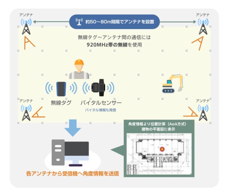 建築現場にて、ヒト、モノの位置を管理するシステム。